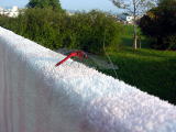 病院のタオルに赤トンボがとまってました。